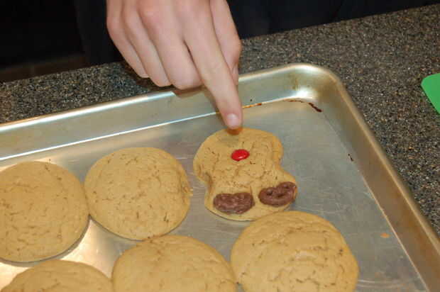 Poner los M & M rojo en el centro de las galletas para la nariz