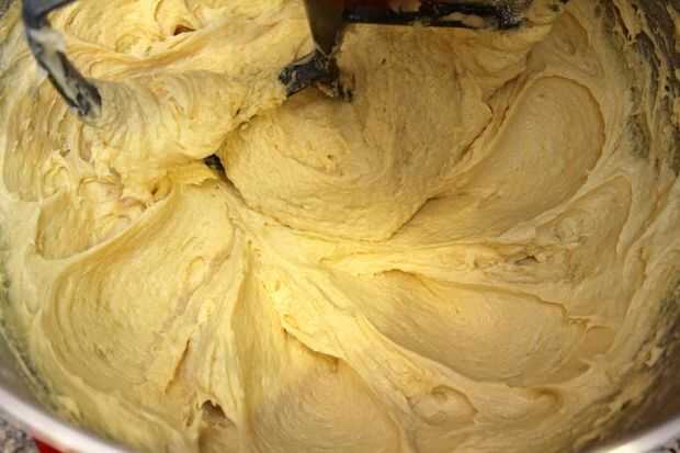 En un recipiente mezclador eléctrico, crema de mantequilla con azúcar blanco y marrón hasta ligero y mullido. Agregar los huevos y la vainilla y mezclar hasta combinar