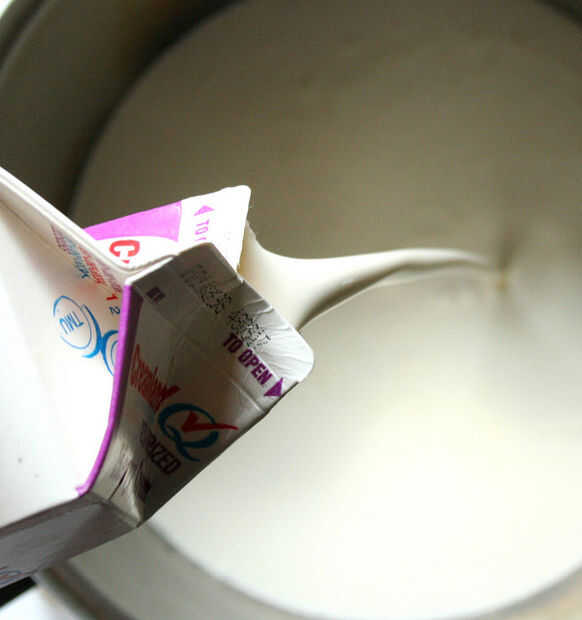 En una cacerola, calentar la crema, revolviendo con frecuencia para disuadir a abrasador, hasta que empieza a cocer a fuego lento y parece que podría empezar en cualquier momento de la ebullición (pero no dejes que hierva).
