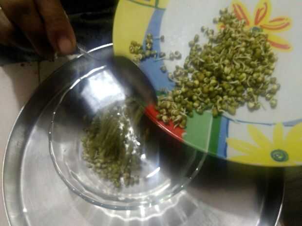 una magnífica merienda saludable que es saludable así como sabroso...Paso 1: ingredientes Un vaso de brotesUn cuarto vaso azúcarCardamomo-2Una cuchara de ghee desiAlmendras-5Paso 2: Hacer germinados Tomar moong completo color verde y vierta agua.Deja