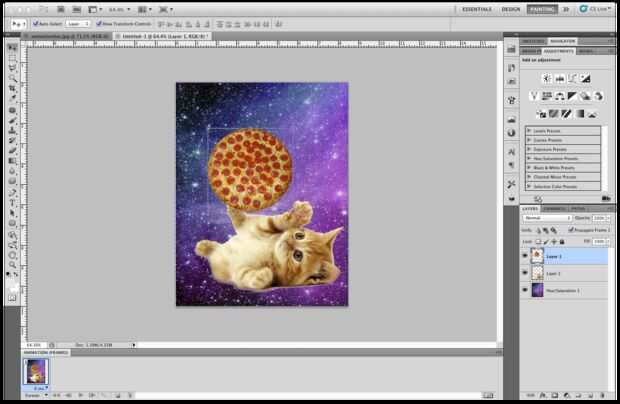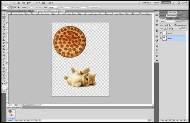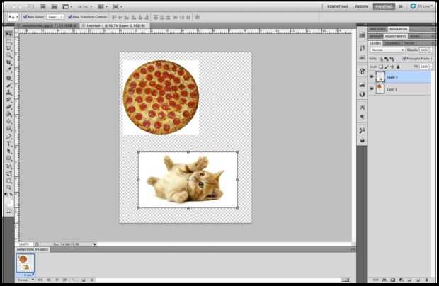 Utilizando los controles de transformación en cada capa (comando + T), escala de la Pizza y el gato para ser más conveniente para mi pizza-arte-vision.