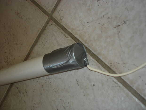 Toma dos 3-4' longitudes de la cuerda y lo mojado para que no se queme en el horno. Poner cada longitud a través del tubo y la tapa un extremo con cinta adhesiva.