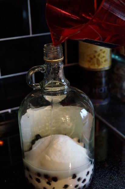 Vierta en 225 gramos de azúcar impalpable, luego 1 litro de Ginebra, sello firmemente.