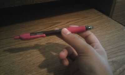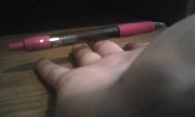 Comenzará por encontrar el punto de equilibrio de le pen. Para ello establecen su mano sobre una superficie plana y levantando uno de sus dedos. Donde equilibra la pluma es en su punto de equilibrio. (Duh).
