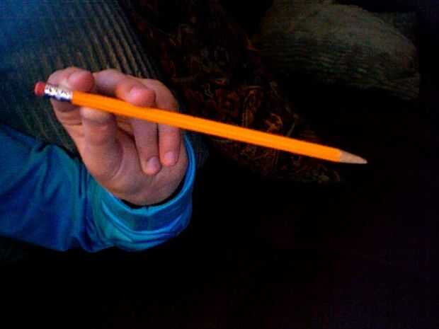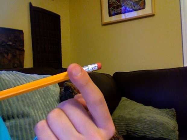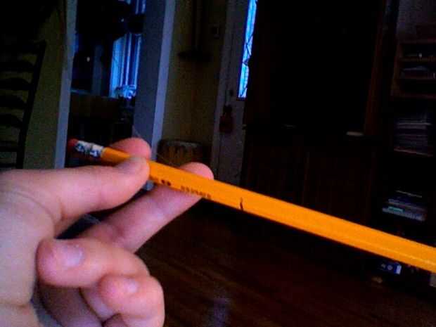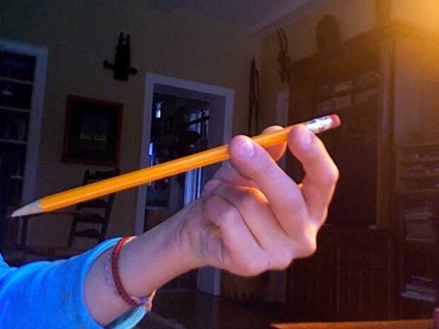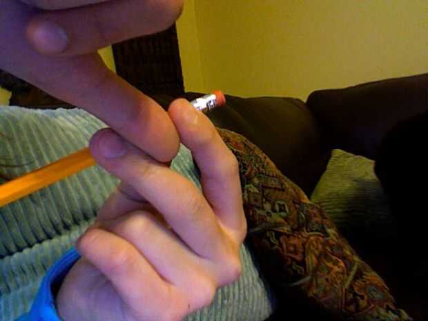 Tomar el lápiz y coloque el dedo puntero justo al lado de la parte metálica de la goma de borrar (ver foto).