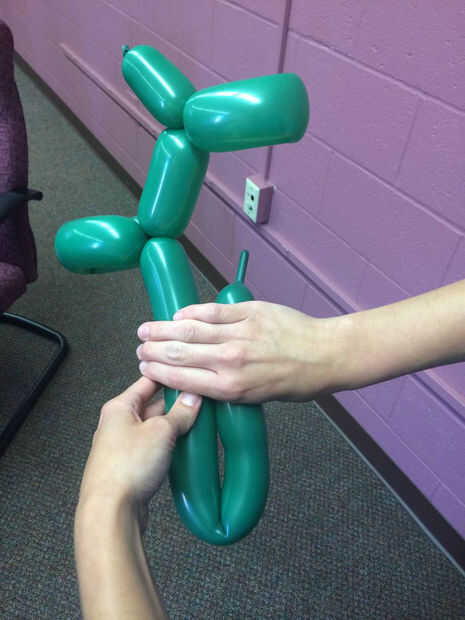 Doblar la parte trasera del balón con dos manos (serán las patas traseras).