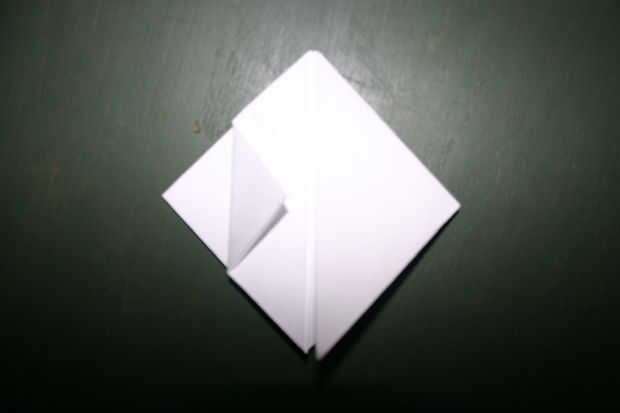 Ahora el papel debería verse como una forma de diamante. doble las dos esquinas exteriores. Repita el procedimiento en la parte delantera y trasera.