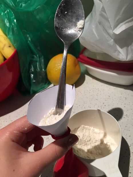 Puesto que mi embudo (casera) era tan pequeña esta parte tomó un buen rato y usé el extremo de una cuchara para ayudarme a conseguir la harina en el globo.