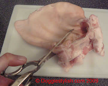 Orejas de cerdo generalmente vienen con el cartílago y los huesos que unen la oreja a la cabeza. Toma tus tijeras o un cuchillo resistente y corte esta parte.