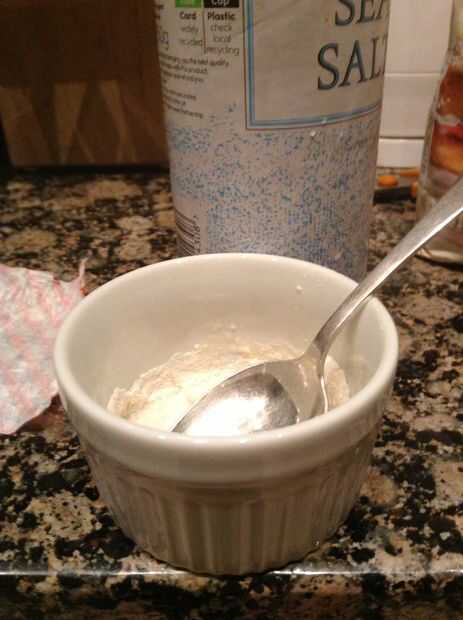 Mezcla de sal, harina y agua en un recipiente hasta obtener una masa espesa.