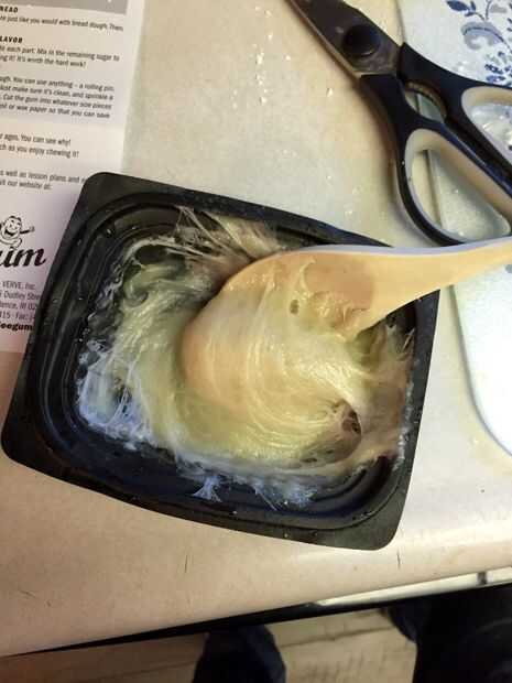 Exprimir el jarabe de maíz en la base de goma de chicle. Agitar la mezcla y vaciar sobre el azúcar sobre la mesa.