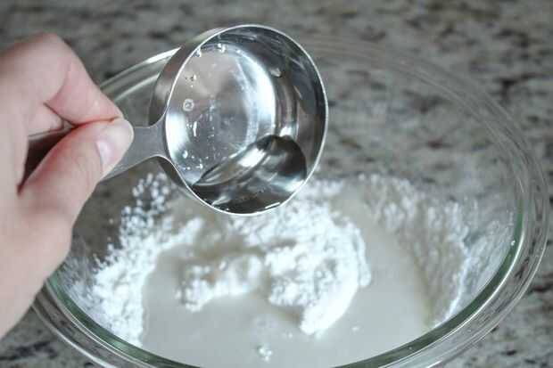 Medir 1/3 de taza de agua y viértala en el recipiente del mismo como el almidón de maíz.