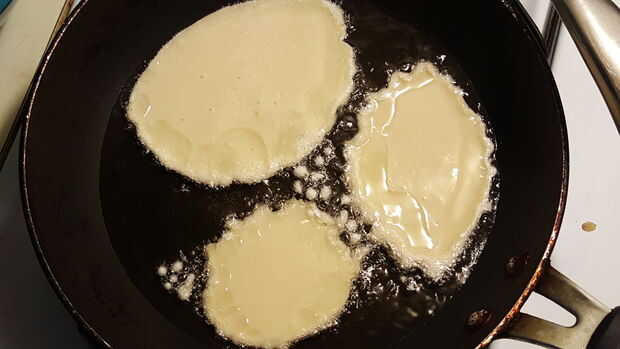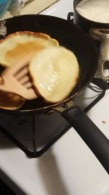 Después de dos minutos para arriba, le da la vuelta les con el spacthula. Lo que espere dos minutos antes de su toma de la bandeja. Después de sacar de la sartén, tendrás que poner servilletas que quitar parte del aceite. Además de ser realmente afectaría al tacto.