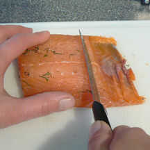 Ahora llegar a hacer su delicioso aperitivo de salmón. Cortar el pescado en rodajas, ir con el grano del prendedero. Me gusta dejar la piel en los peces, mientras que algunas personas se la cortó. Cortar sólo lo que vas a comer enseguida y refrigerar el pescado sin utilizar.