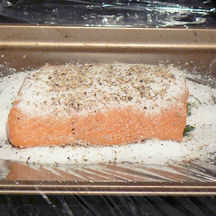 Rocíe una cantidad generosa de la mezcla de sal/azúcar sobre el filete, cubriéndolo totalmente. Ahora moler una cubierta ligera de pimienta sobre el filete de salmón.