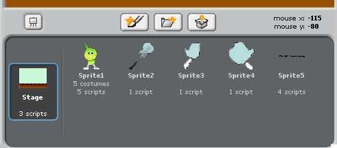 1) volver a tu juego de Scratch y haga clic en el icono de carpeta para descargar un gráfico. El gráfico aparecerá como un Sprite en su juego.