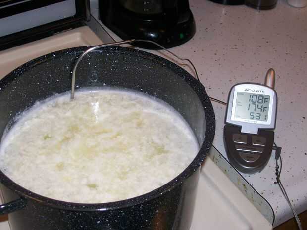 Aplicar calor bajo y remover la cuajada de vez en cuando para mantenerlos separados hasta llegar a 108 grados. Esto le llevará unos 15 minutos. La cuajada se encogen y empezar a lavabo como el suero es expulsado de ellos.