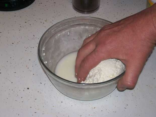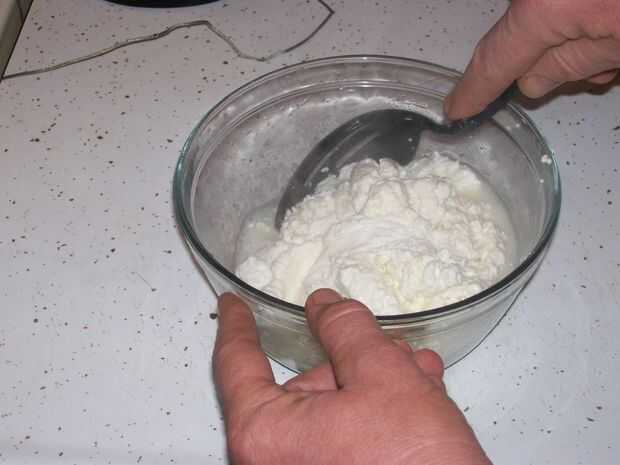 Utilizando la espumadera o tu mano suavemente apriete el suero de la cuajada. Retirar el suero.