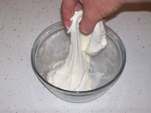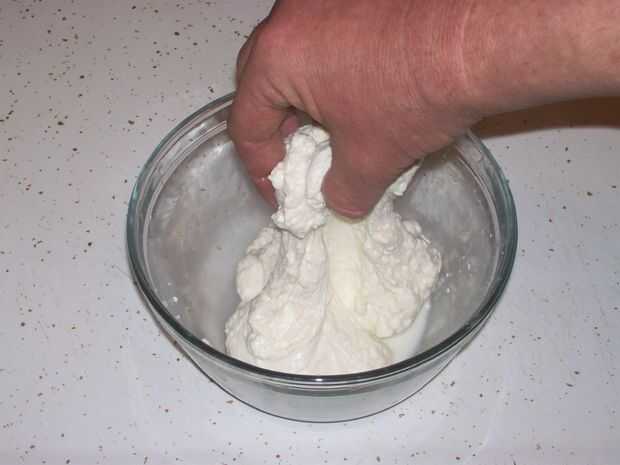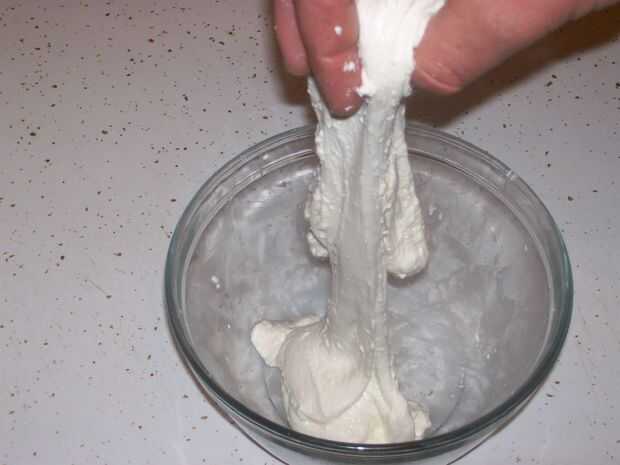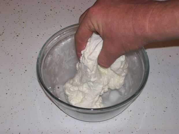 Vuelva a poner en el microondas durante 20 segundos. Añadir la sal. En este punto si es caliente suficiente debería comenzar a ser flexible y elástico. YEAH!!!. Tomar 1/3 a 1/2 y levante. Debe empezar a estirar por su propio peso. Si no ponerlo en el microondas durante unos segundos más. Mientras se trabaja a través de la extensión proceso también amasa como el pan un par de veces. Si el microondas es necesario de vez en cuando hasta que el queso se parece a la última foto.