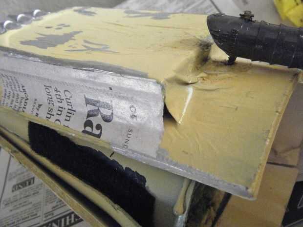 usé tornillos perforados por el interior/salida para montar el foamboard. Corté las formas que necesitaba basado en fotos del brazo guantes utilizan en el cine, caliente pegan en su lugar y cubrían con papermache. Después de todo, secado, les di una capa de pintura de plata. que el látex líquido seco, utilizado para hacer sustos de batalla desgastado, dejar secar y luego la pintura de color.