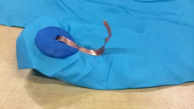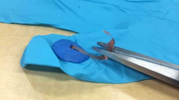 Una vez la cinta de cobre se fija en el guante, tomar tijeras para cortar la porción sobrante de la cinta.