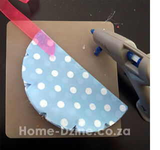 Esta parte es complicada pero perseverar. Ventilador abierto la mitad pegada los círculos, para que complete un círculo completo. Utilice pegamento caliente para unir los dos semicírculos juntos.