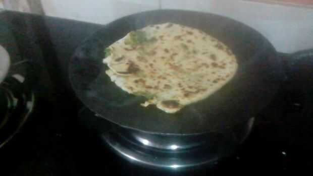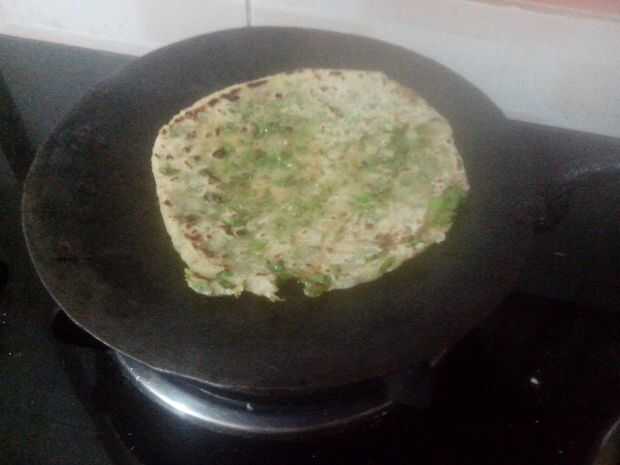 Ahora para cocinar la arveja Paratha, primero Precaliente la sartén a fuego medio. Coloque el paratha laminado en la parte superior y deje que se cocine de un lado. Después de unos 10 a 15 segundos, voltear el paratha. En esta etapa, untar algún aceite o manteca para cocinar el paratha. Cocinar el paratha por los bancos durante un par de veces hasta que vea manchas doradas de ambos lados.