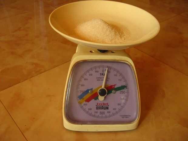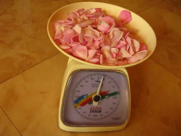 Pesar los pétalos de rosa y pesar igual cantidad de azúcar
