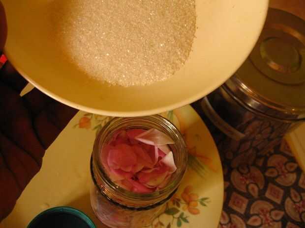 Añadir los pétalos de rosa y el azúcar en capas en la botella