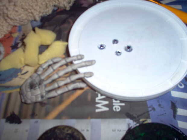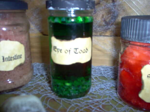 Para hacer ojos de sapo gotas de pegamento caliente sobre la hoja deje que se enfríe. Entonces utilice el marcador de punta de fieltro para dibujar puntos en cada gota. Quite los globos oculares dejando la hoja adjunta a la parte trasera. Esto es lento pero los globos oculares más haces mejor se ve. Poner en un frasco de agua, añadir verde una gota de colorante a la vez. Se ven mejor cuando el color es un poco más oscuro.