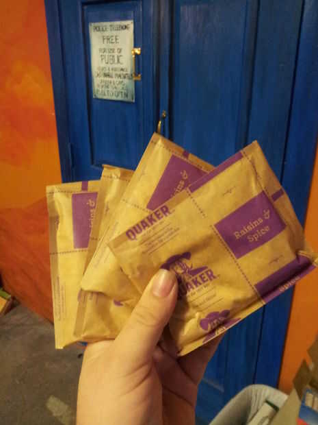 Abrir cuatro paquetes de avena instantánea. Si usted no tiene ninguna avena, simplemente su T.A.R.D.I.S. e ir a buscar algunos.