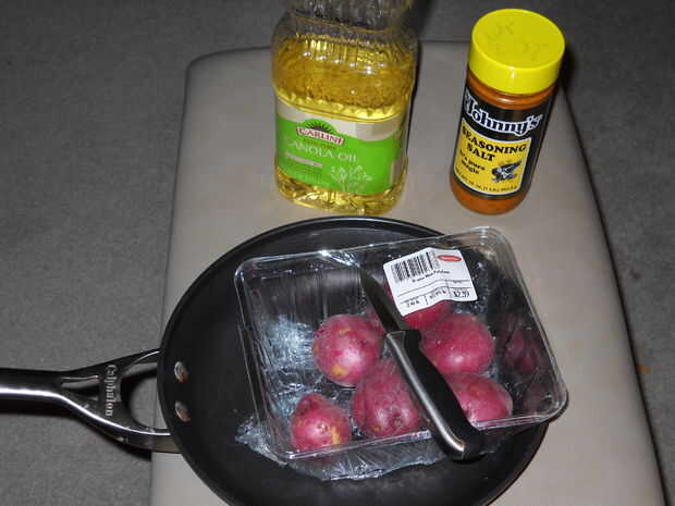 Antes de empezar hay algunas cosas que usted necesitará tener a la mano. Se necesita: -Patatas, hará cualquier variedad. Reunir tantos o tan pocos como desee. -Un cuchillo -Una sartén -Aceite de cocina, usé de canola -sal condimentada, u otro tipo de sazonador