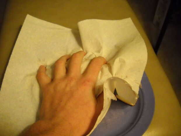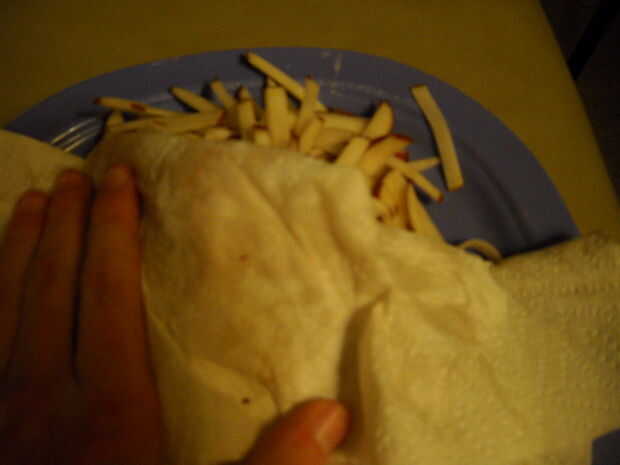Para guardar sus papas de ser empapado, necesitará secan un poco.  Esto puede hacerse fácilmente con una toalla de papel, como se muestra en la imagen.  Seguir exprimir las papas hasta que no haya ningún líquido visible.