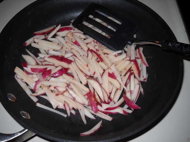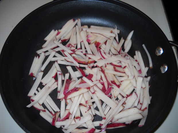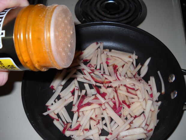 Coloque los palitos de patata en una sartén y revolver con una espátula.  Añadir unos 2 dos cucharaditas de aceite por cada medio tamaño patatas, usaste.  Uso menos o más dependiendo de su preferencia.  También, añadir sal sazonada.  Prefiero de Johnny.