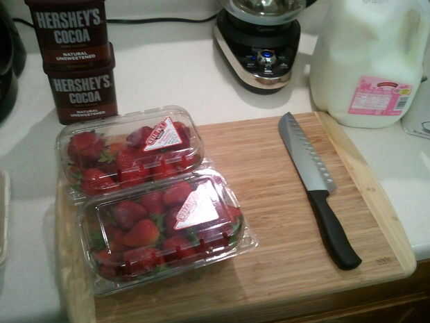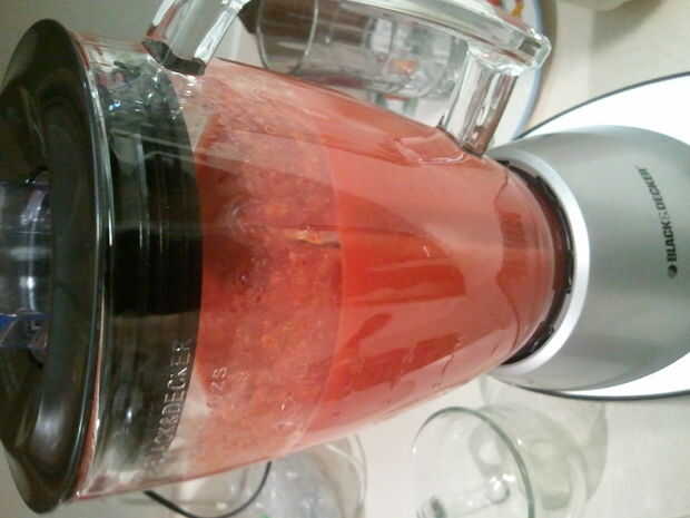 Luego picar las tapas de las fresas y puré de las fresas y colar de los trozos de fresas y mantener el puré. Me gusta mi helado con trozos por lo que mantiene los trozos de fresas.