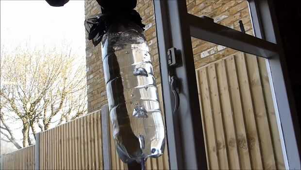 Una vez que la botella de almacenamiento está llena, el exceso hidrógeno burbujea a través de la botella de expansión superior y se puede recoger por asegurar una bolsa de basura sobre la parte superior con una banda elástica.