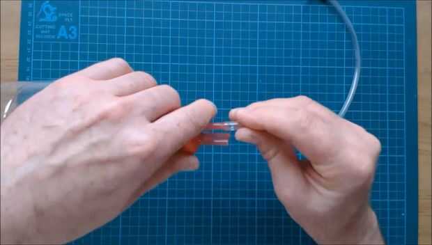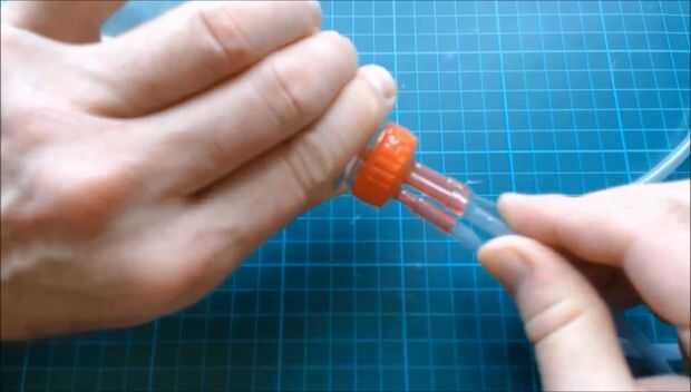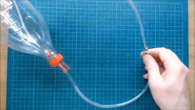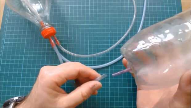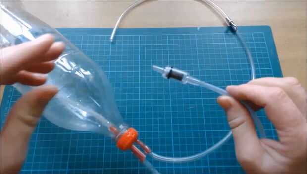• Colocar el tubo a uno de las dos pajas más dentro de la tapa de botella de almacenamiento de gas (1 botella de soda)
