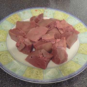Cortar el hígado en trozos de 2 X 2 pulgadas, como en la segunda foto. Ahora es el momento de precalentar el horno a es más bajo ajuste, que suele ser 250F.