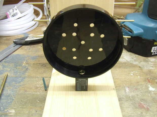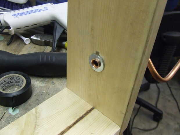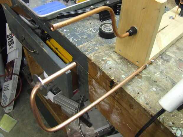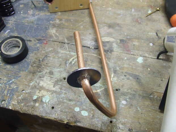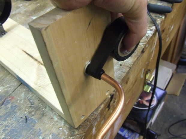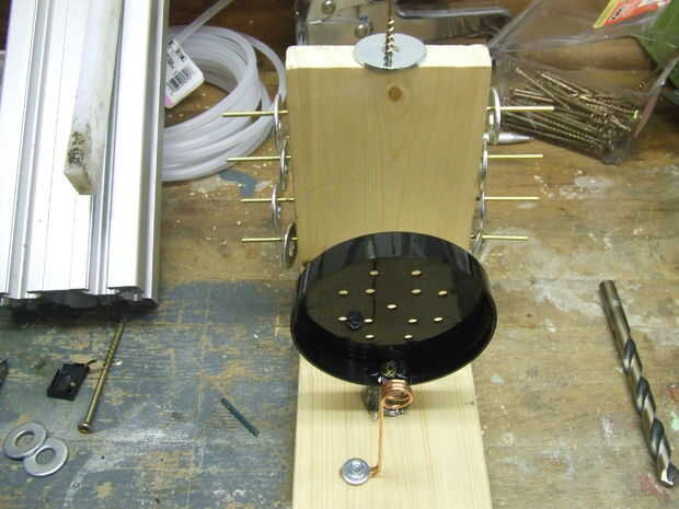 2: hay una guía de ojete necesitada y esto fue hecha por enrolle un pedazo de alambre de cobre desnudo (cable de tierra eléctrico doméstico) alrededor de una broca de 5/8 de pulgada. El centro de la anilla se alinea con el agujero central en la parte superior del agitador. La base de la anilla se atornilla a la base de la máquina mediante un tornillo corto.