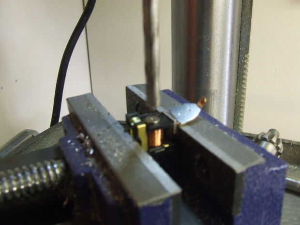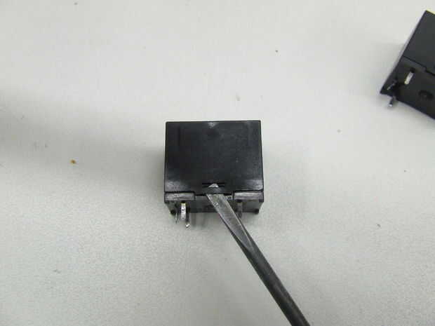 Estos Omron G5LE serie (puede encontrarse en Digikey para alrededor $2 cada uno, si usted necesita comprar) tiene una tapa que se quita fácilmente apalancando suavemente con un destornillador. Usé una de estas tapas para el apoyo de la guía de alambre en la máquina en el paso anterior. (se fue perforado con un agujero pequeño al extremo para este propósito).
