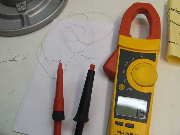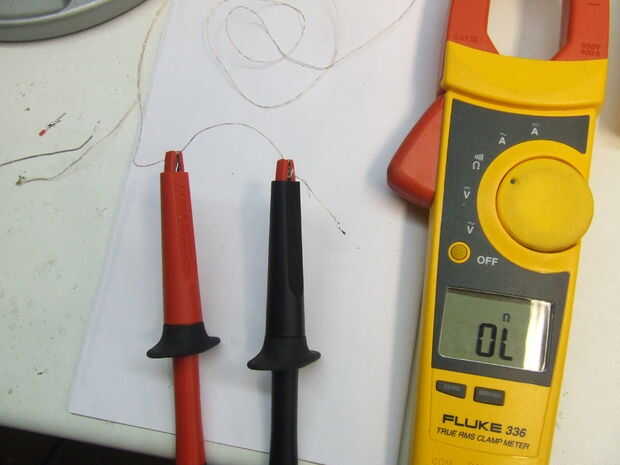La última fotografía muestra que una longitud de 1,5 metros de hilo con extremos de soldadura sólo tiene 1,9 ohmios resistencia