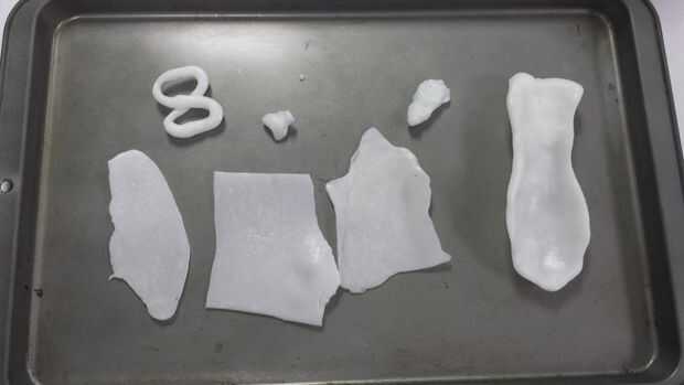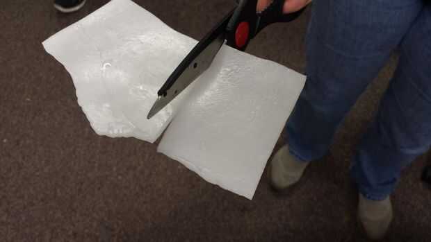 Instamorph en hojas planas se puede cortar con tijeras o con una sierra (si es más gruesa que 1/8") pero con las tijeras es mucho más fácil de cortar mientras el material está comenzando a enfriar. Varias muestras de piezas aplanadas y algunos usos de ellos pueden verse en la última foto donde fue rodada y se unieron para hacer una figura 8 una hoja plana y a la derecha donde estaba doblado doblado sobre y entonces formado en un canal curvo para probar su resistencia estructural.