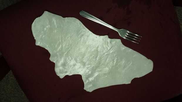 La hoja más grande hice llena la bandeja de principio a fin casi de 16 pulgadas y se puede ver la comparación del tamaño de la horquilla en el cuadro. Obtendrá un resultado más suave y más si dejas que el material fresco lentamente en el aire, puede ser incluso mejor emparedado el plástico entre dos capas de antiadherente mientras se enfría, pero no he probado esto todavía.