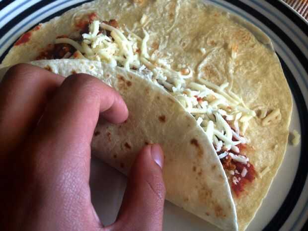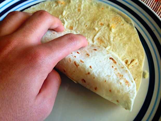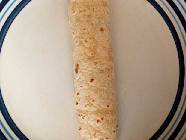 Doblar la tortilla con el relleno como un burrito, mantener rodando y poner la tortilla superior bajo el relleno!