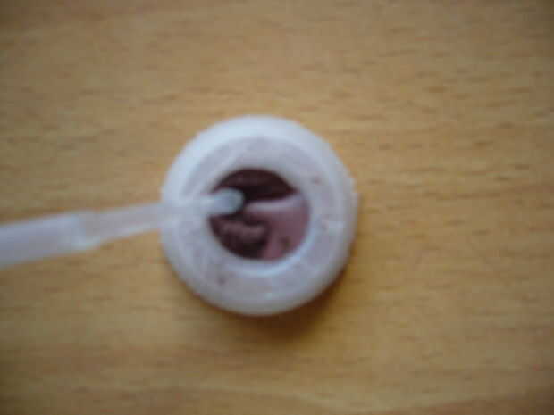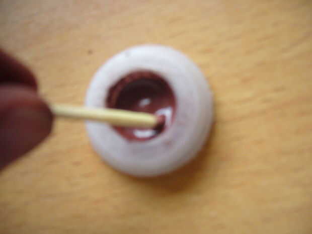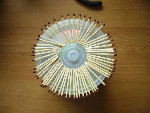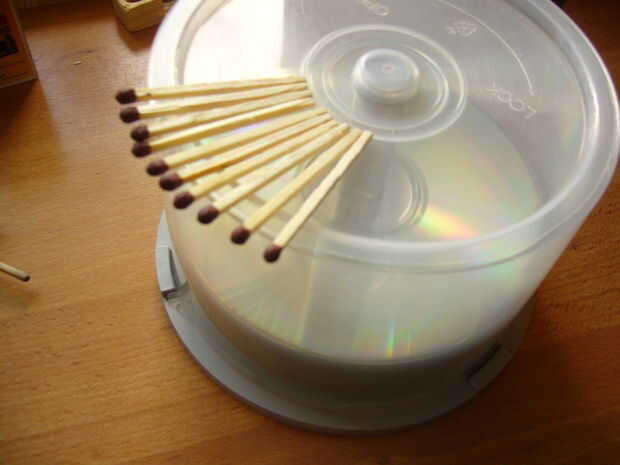 Poner unas gotas si el agua en el recipiente y revolver bien. Tomar los partidos uno por uno y dip en la mezcla. Luego los ponen en el borde de la caja de la mesa/CD.