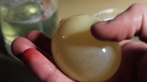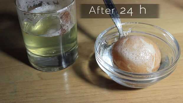 Deje el huevo en vinagre durante 24 horas y después de tirar hacia fuera para lavado con agua limpia, cuando toque el huevo puede cayó el huevo se convirtió como el caucho, este procedimiento se le llama ósmosis