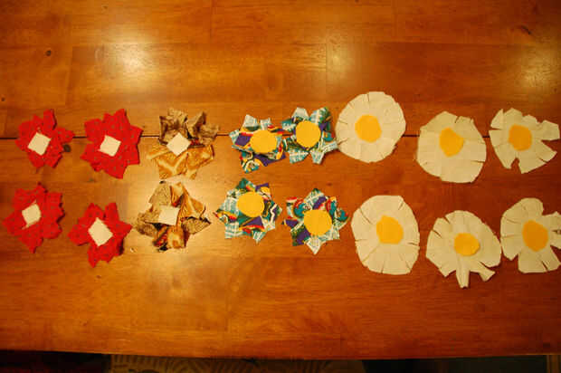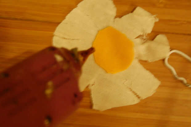 Corté a la tela áspera formas cuadradas y circulares. Entonces, hice cortar alrededor de los bordes para formar los pétalos. Fui muy rápido, por lo que son bastante duro. Luego corté un montón de pequeños círculos para los centros de flor (bulbos de polen?). Un poco de pegamento caliente mantiene las flores juntos.