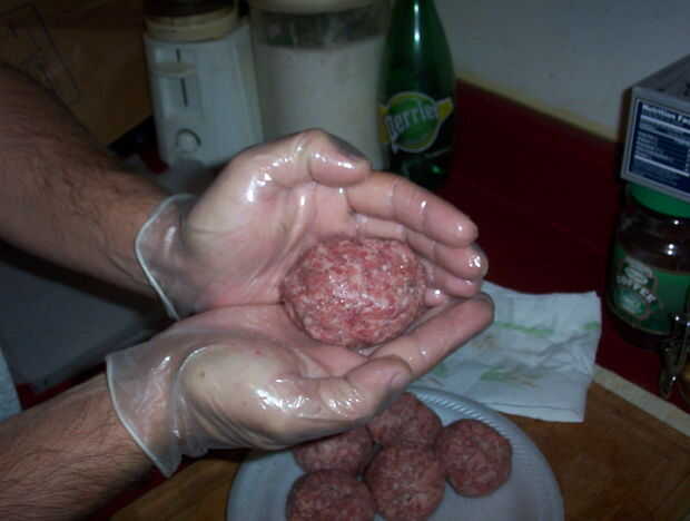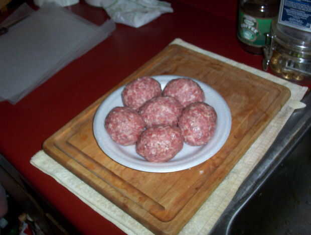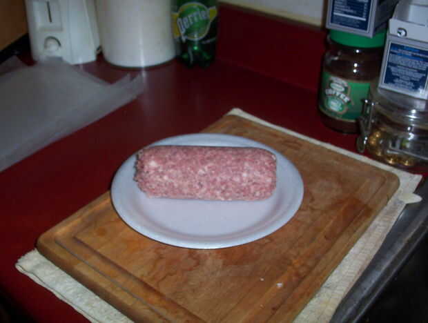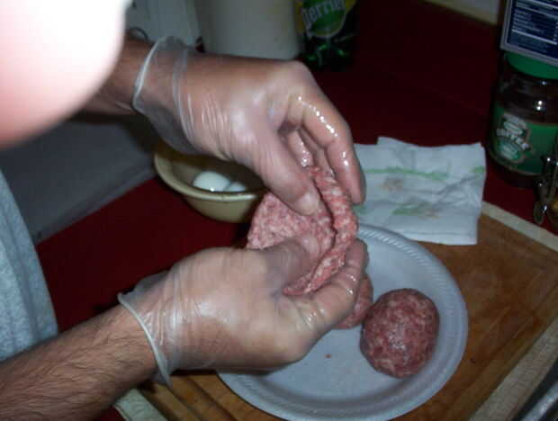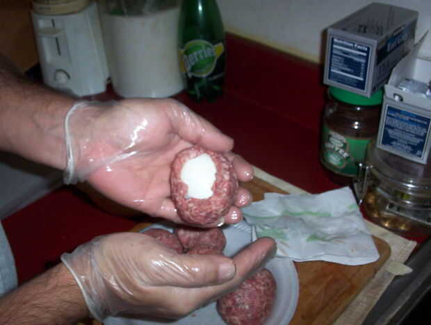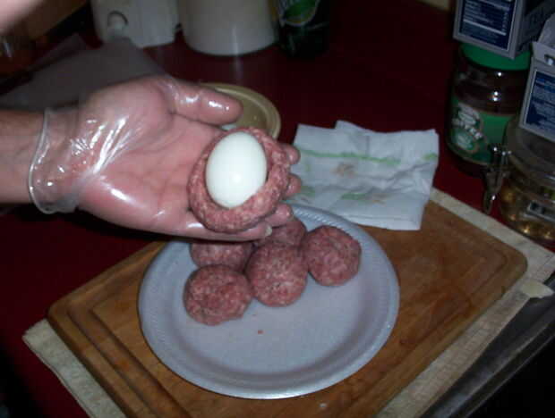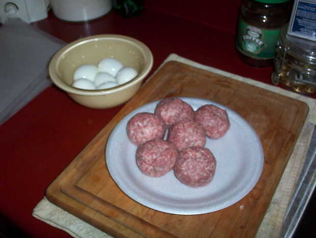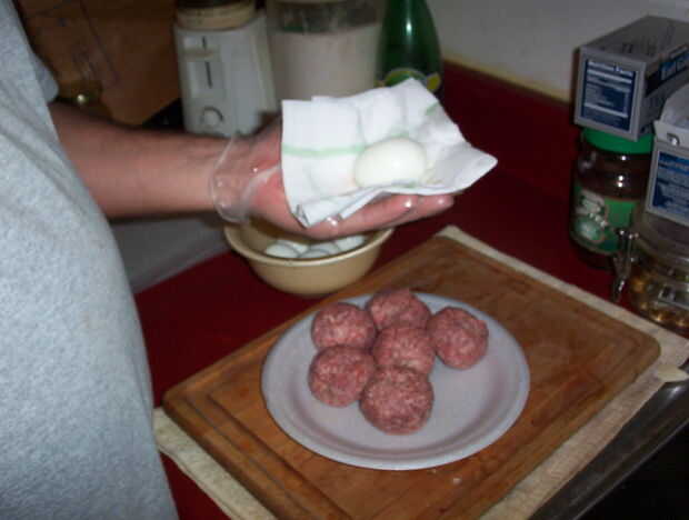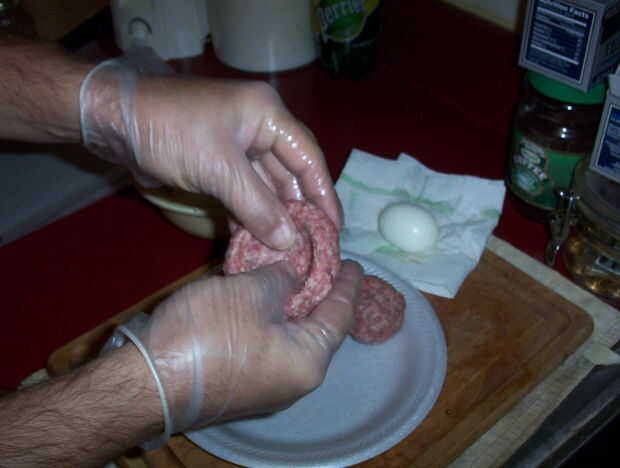 Tomar una de las bolas de salchicha de la nevera y con el pulgar, hacer una gran muesca en el balón. Debería verse como una forma de la taza de chorizo. Trabaja suavemente en forma de recipiente, manteniendo la salchicha a un grueso incluso todo el camino alrededor, como en la foto. Tome uno de duro cocido huevos fuera de la vasija de agua y seque con una toalla de papel. Poner lo secos de huevo duro en la salchicha "bowl" y suavemente empezar a formar la salchicha completamente alrededor del huevo. Intente mantener la salchicha un espesor uniforme como se forma una capa de chorizo alrededor de cada huevo duro. Cuando termine, debe parecerse a la foto de un huevo totalmente encerrado de salchicha. Poner en el refrigerador y no los otros 5 huevos. Cuando tengas todos los 6 huevos hechos, coloque la placa entera de huevos envueltos de salchicha en el congelador para el siguiente paso.