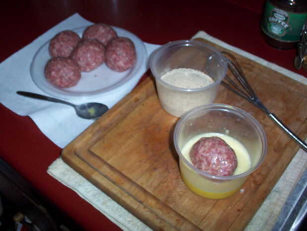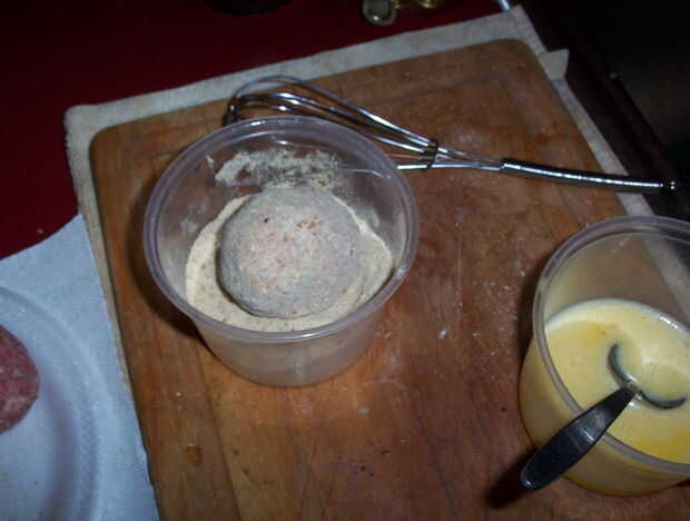 Hacer esta parte uno a la vez, de lo contrario conseguirá realmente desordenado! Tome un huevo salchicha envuelta y rodillo en los huevos batidos al capa y cubrir completamente. Usando una cuchara grande, coge el huevo de la colada de huevo y ponerlo en el pan rallado. Gire suavemente cada huevo alrededor de las migajas de pan para cubrir completamente cada huevo. Ponga cada uno detrás de la placa con los otros huevos, como lo hace cada uno, hasta que son cubiertas con huevo y pan rallado. Una vez que tienes todo cubierto, repita el proceso, hasta tener dos capas de pan rallado.