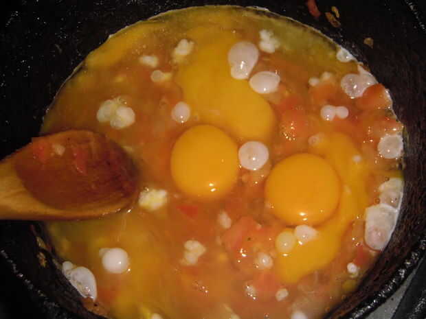 Cuando el tomate y la cebolla estén listos (unos 5 minutos después de poner en los tomates) agregar los huevos. Aquí es donde pones la sal y la pimienta.